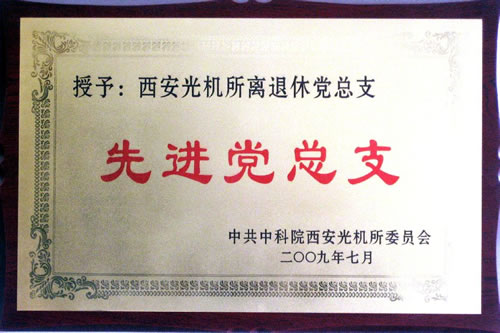 2009年 西安光机所党委授予离退休党总支“先进党总支”