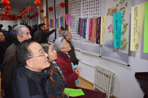 下午2:30 离退办一楼大厅主会场及外厅分会场座无虚席热闹非凡。主会场分会场挂满了红红的灯笼,200幅鲜艳的谜条更是烘托出了浓浓的节日氛围。离退办主任、离退休党总支书记李广路首先传达了所党政领导对广大离退休职工及家属的节日问候和祝福,陈述了为办好活动所做出的努力,感谢为本次活动隆重举办付出辛勤汗水的离退休志愿者及工作人员。随后,猜谜语活动拉开帷幕,此次猜谜活动分竞猜谜语和谜语自由猜环节。猜谜分字谜、成语、知识、生活四个类别,活动内容广泛,既有通俗易懂的趣味猜题,也有较为复杂的抽象谜题,既有娱乐性,又有知识性。老同志们有的站在灯谜纸条前仔细端详、凝思苦想,有的带着纸和笔细致地写着画着,既严肃认真又开心热闹。现场即猜即奖,猜中者便可领取一份小礼奖励。大家三三两两地聚在谜题下细心斟酌、认真思索,不时传来欣喜的欢呼声,每位老同志脸上都洋溢者幸福的笑容。