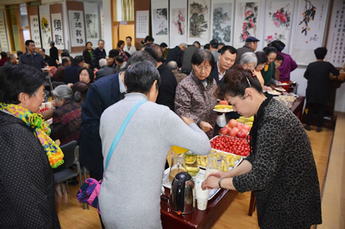 本次活动采用茶话会形式,活动大厅、外厅与多功能厅等四个会场同时进行,数十桌联袂排开,每桌8到10人,场面甚是壮观喜庆,大家一边品尝水果和点心,一边聊天增进感情,甚是开心。为了增进大家对养老知识的了解,大会特别精选了中央电视台纪录片《养老中国》文化养老、社区养老的板块,介绍了中国社会养老现状,探讨了“中国式养老”话题,增进了大家对养老社会化的理解。