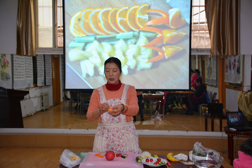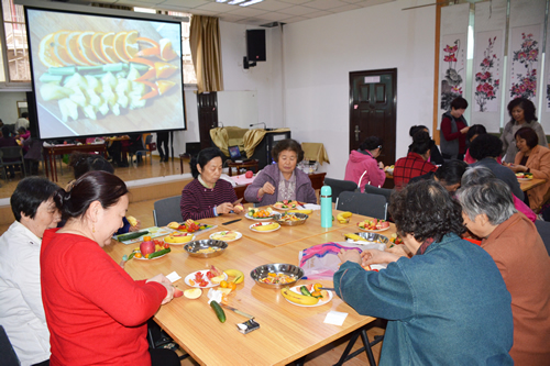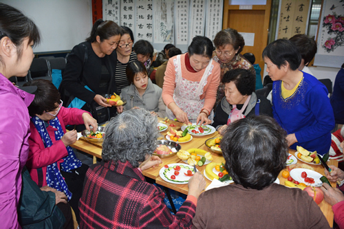 3月7日下午,水果拼盘活动现场更是呈现出和谐温馨的氛围。首先邓宁老师给大家讲解了如何构思、色彩搭配、常见水果的营养功效和造型制作等果盘基础知识,随后老同志们发挥自己想象力、创造力,边操作、边切磋,不一会儿,一个个水果在她们灵巧双手的切割、排放下呈现出一盘盘奇特的造型,还自拟了很多有创意的“春日繁花”“果木香丰”“ 鲜果密语” 等众多品名,令老同志们乐此不疲。