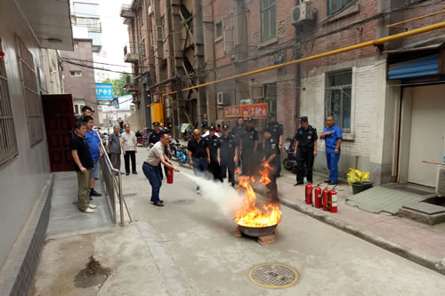 徐建刚主任首先通过全国典型火灾案例向大家讲述了火灾的严重危害,以引起大家对火灾的高度重视。他深入剖析了火灾发生的原因,比如:煤气泄漏、电线老化、漏电、操作失误等等,教授大家如何提前预防,也教授大家面临这些意想不到的灾难时,如何进行自救,如何在保护自己生命的同时又能将损失降到最低。针对老年人群体他还重点讲解了使用燃气的安全常识:如油锅起火、煤气泄漏、煤气管道老化等问题,建议大家禁止违规操作,定期更换胶管,安装预警设备。他讲解了各种灭火器的配置和功效,同时还向大家现场演示了具体使用方法、逃生自救技能等。徐建刚教官还通过提问等方式加深了与会人员对消防安全知识的印象。讲座结束以后,大家来到门前空地上,对灭火器的使用进行了实地操作演练,通过徐教官的讲解示范,大家逐一试用,掌握了灭火器的正确使用方法。