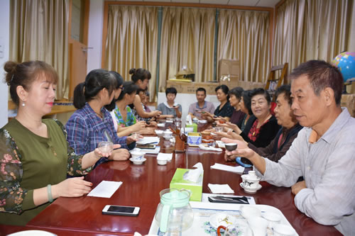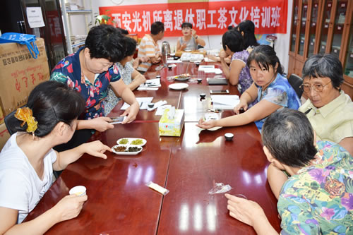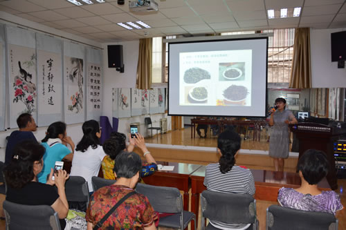 在8月23日的开班仪式上,毕老师循序渐进的从茶文化起源、茶文化内涵、茶叶种类讲起,为大家呈现了不同地区、不同国家丰富多彩的茶文化,营造了令人身心愉悦的和谐氛围。接下来几天,毕老师采取边讲边品的形式,对绿茶、黑茶、乌龙茶、黄茶、白茶等各类型茶叶的产地、形状、生长环境以及采茶、制茶、饮茶的工艺和方法等进行了全面讲解,通过赏茶、闻茶、饮茶、品茶,将中华文化内涵、待人接物礼仪、人生道德哲理等内容融入到了修心养性的茶道中,让老同志们感受到了中华传统文化与艺术的双重陶冶。最后,毕老师应老同志们要求,手把手地教授大家茶艺表演步骤及技艺,参训的茶艺爱好者们伴着优美高雅的音乐、在深幽雅静的环境中亲手沏泡浓郁清香的茶水,互相品鉴,切磋技艺,品味人生。一周的培训结束后大家意犹未尽,都期望将来还要常在一起品茶论道。
